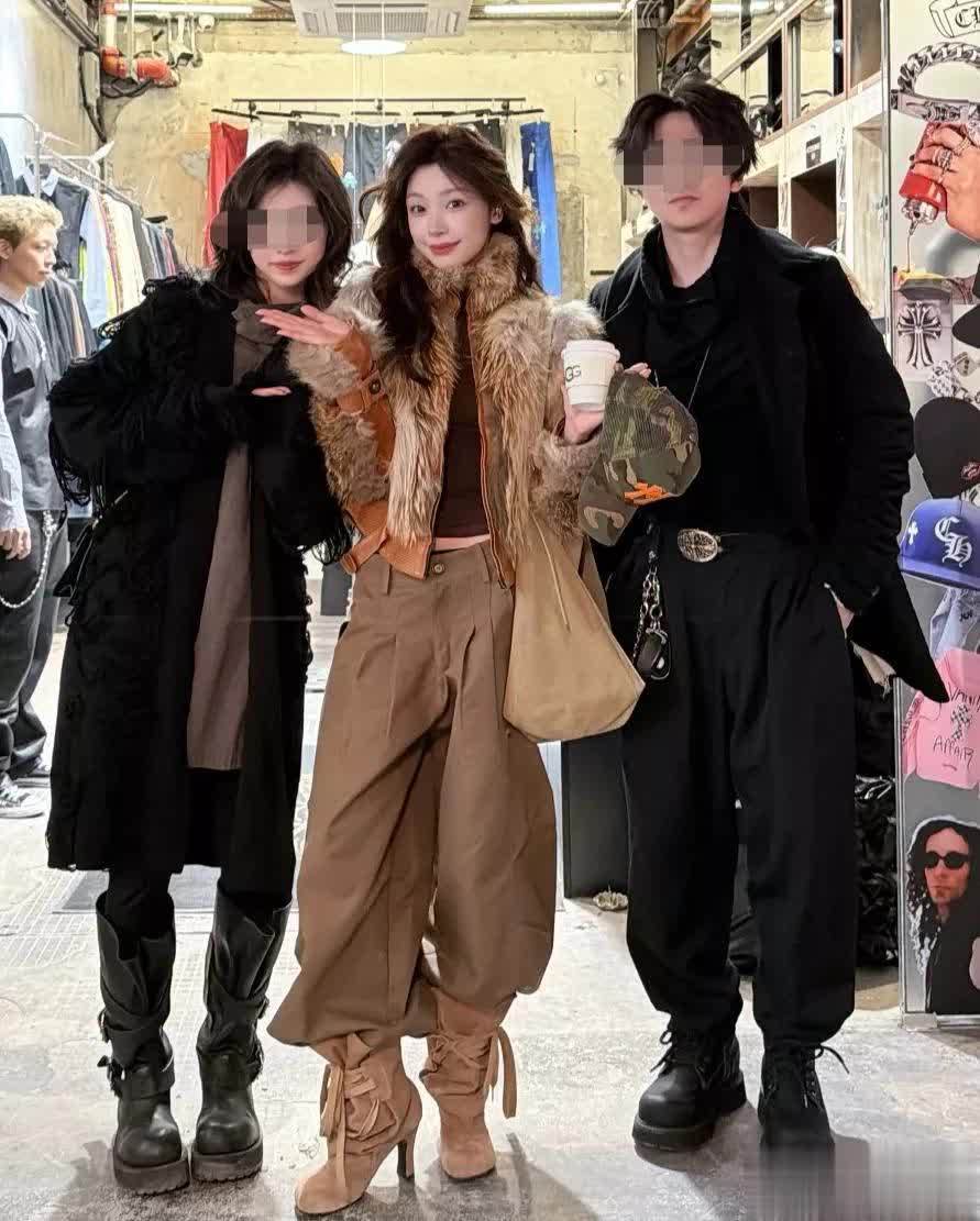 她穿了一件深色打底衣外搭毛绒外套,下身是宽松的阔腿裤和高跟靴。